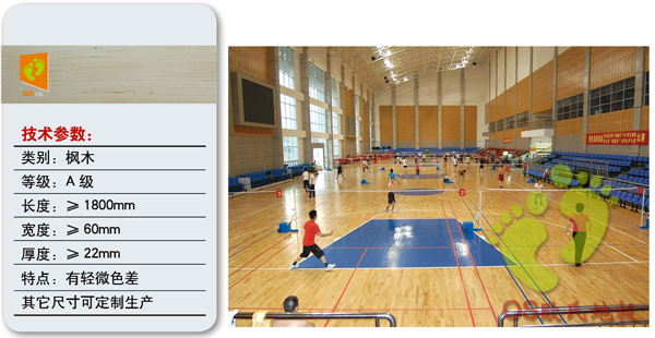 面層地板:楓木、柞木,體育運動木地板厚18mm至22mmm 寬為50mm至130mm 長度為300mm至2400mm;