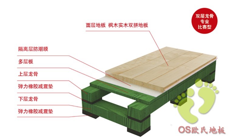 雙層龍骨結構是體育木地板中一種懸浮式木地板結構,它不但堅固耐用而且彈性十足,運動性能完全滿足DIN標準的要求。提供出色的彈性而且具備有效的減震功能,地板結構性能比較均勻,滿足用戶對地板各項性能、外觀和耐久性的要求,該系統擁有**的振動吸收,具有空前絕佳的運動性能,符合所有訓練或者體育比賽的要求。